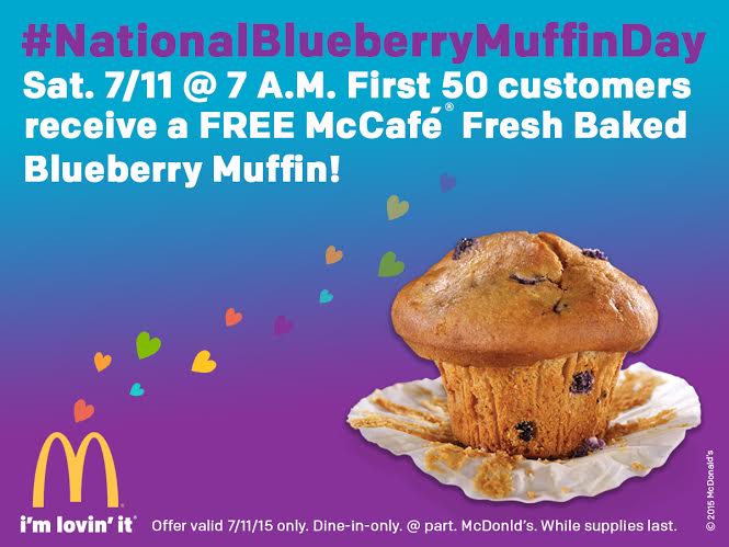 In honor of National Blueberry Muffin Day, on Saturday, July 11, participating McDonalds restaurants will be giving out fifty Freshly Baked Blueberry Muffins to in-store customers beginning at 7:00 a.m. For free. Free blueberry muffin. Are you getting this?